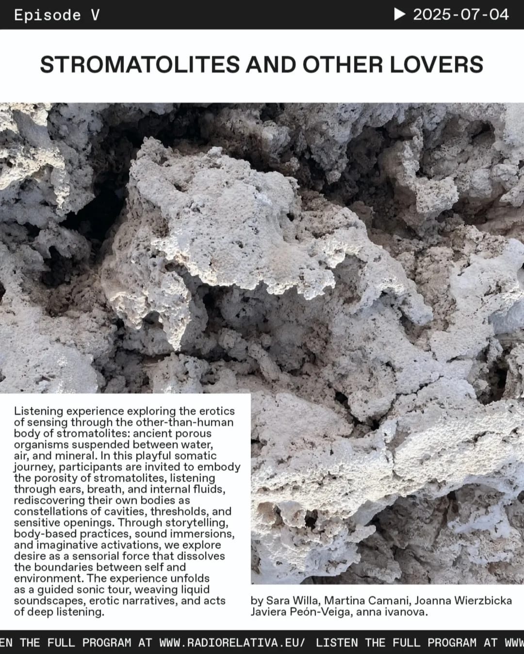 In this playful somatic journey, participants are invited to embody the porosity of stromatolites, listening through ears, breath, and internal fluids, rediscovering their own bodies as constellations of cavities, thresholds, and sensitive openings.